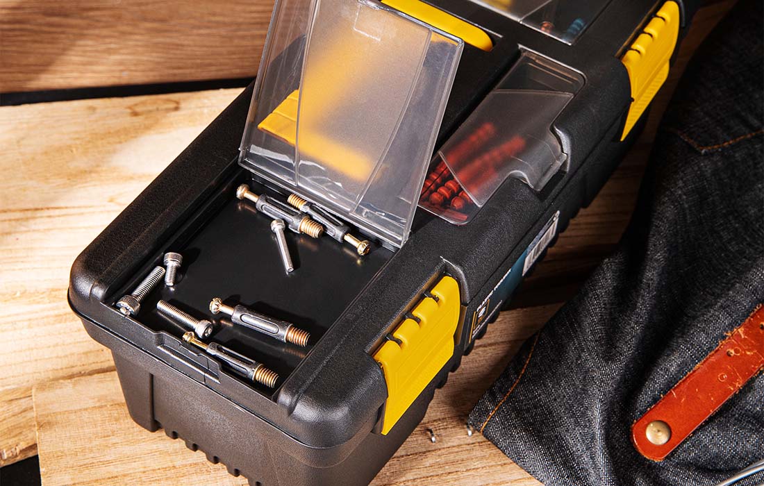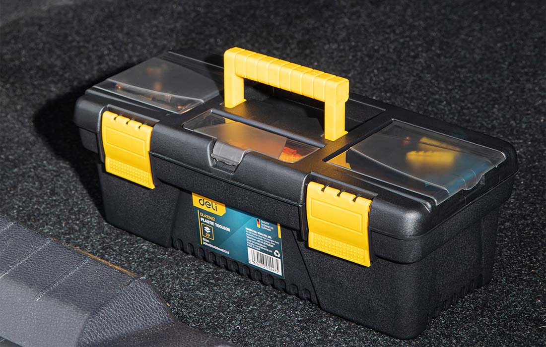 A toolbox is a must-have for every handyman, which is why Deli Tools specialists designed model EDL432412. With dimensions of 305x130x105mm and practical compartments, it can hold a variety of keys, nails, screws, etc. It is made of plastic and has a handle on the top for comfortable carrying. In addition, non-slip pads give it more stability.
